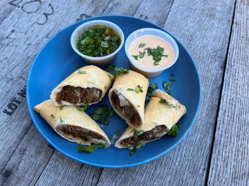 IT'S BACK!!!! Crispy rolls filled with Birria and Cheeses. Served with sides of consommé and queso